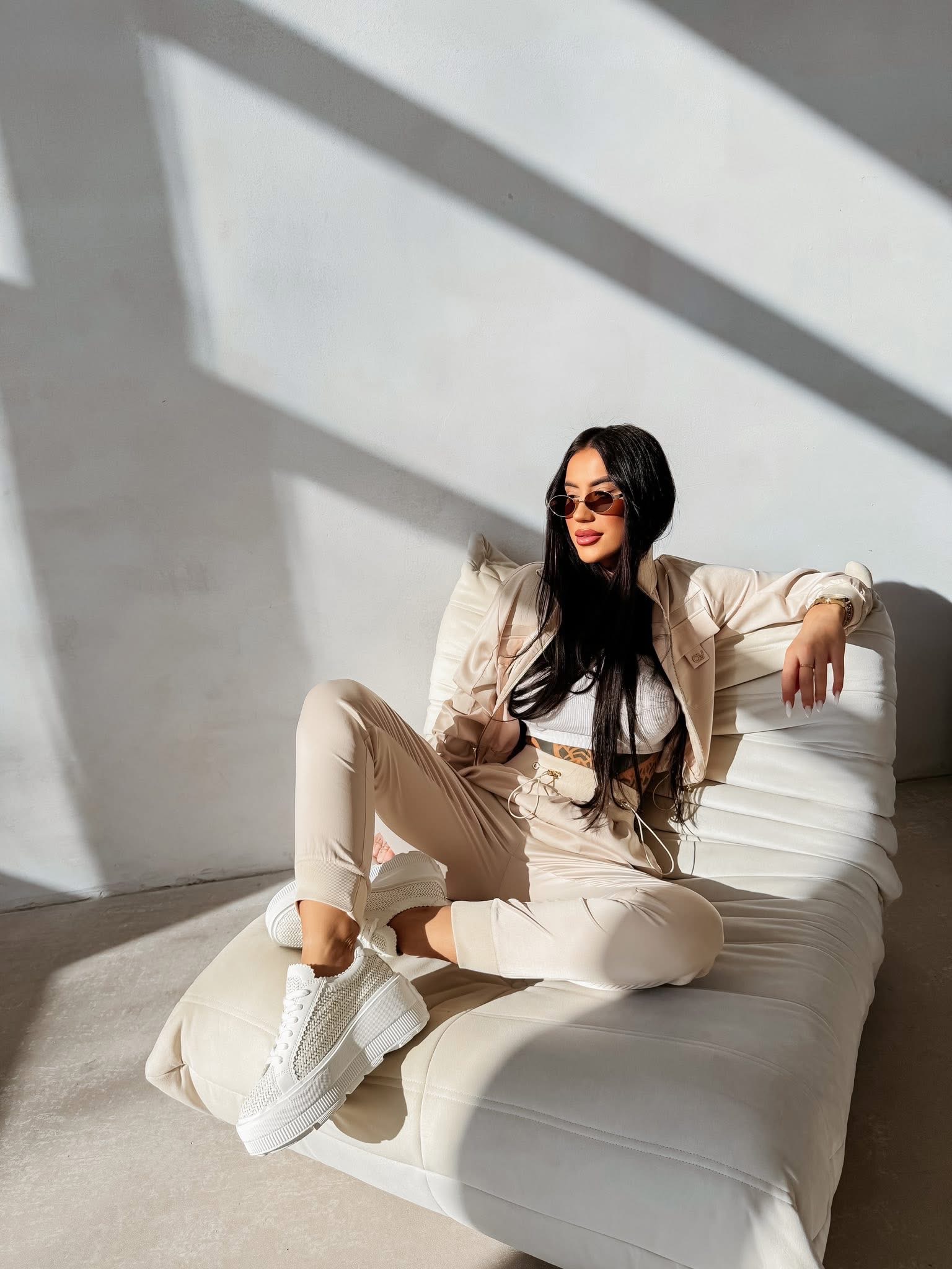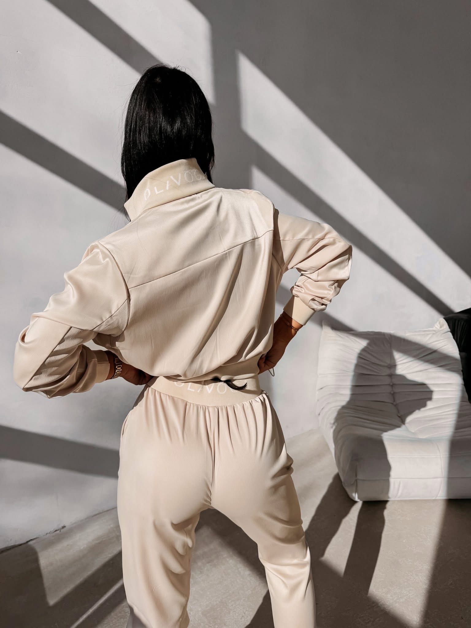 Mikina má skrátený strih, zapínanie na zips a predné vrecká s ozdobným zlatým nápisom OLV.