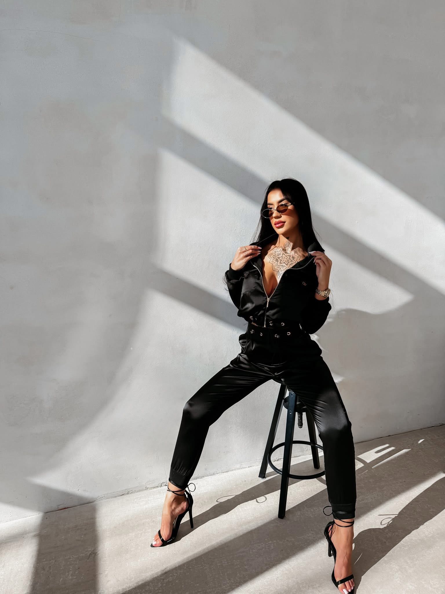 Dámske legíny majú priliehavý strih a vysoký pás. Model má široké nohavice a bočné zaväzovanie so zlatými očkami.